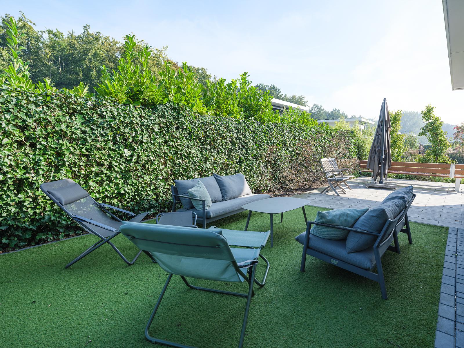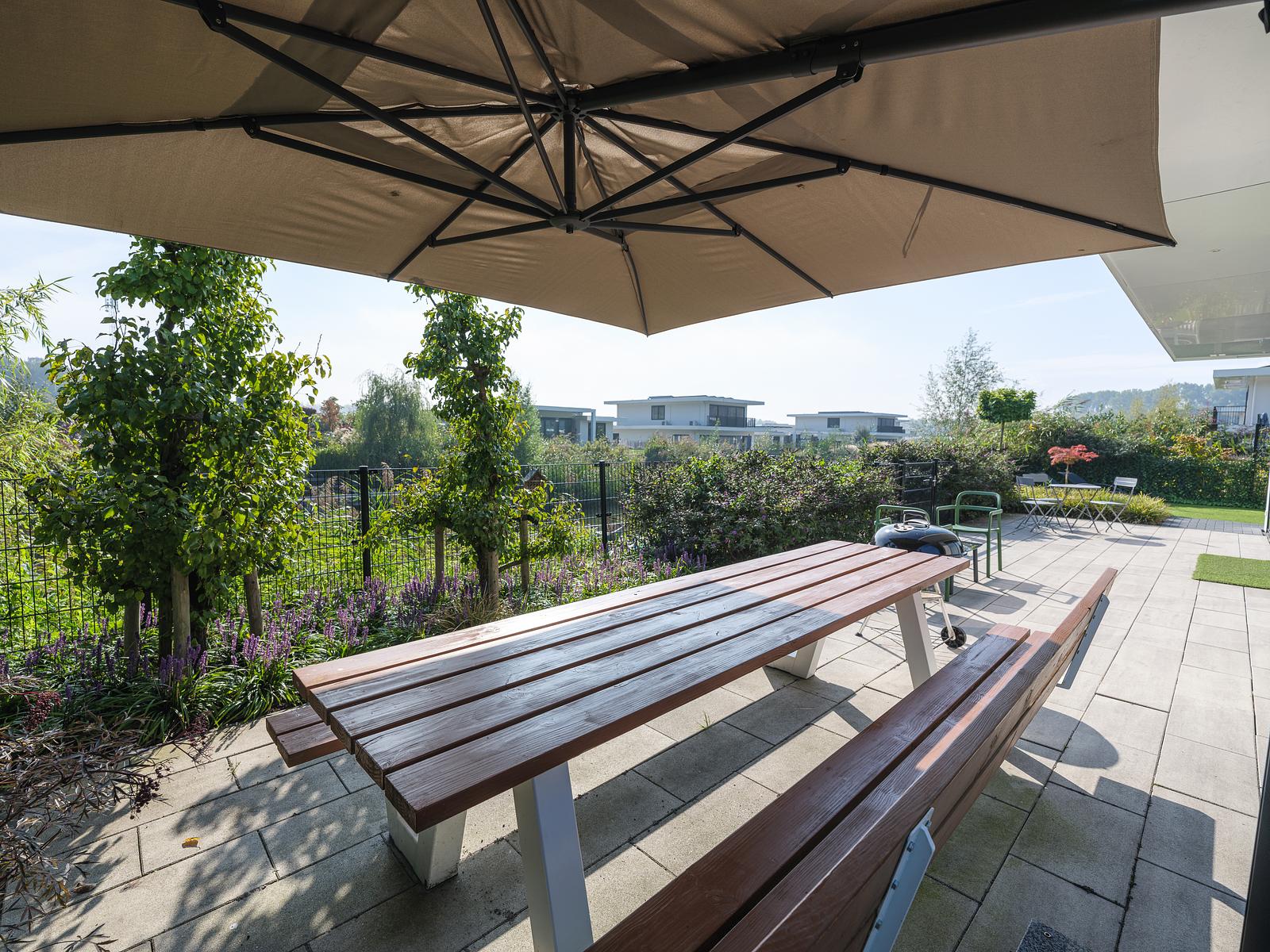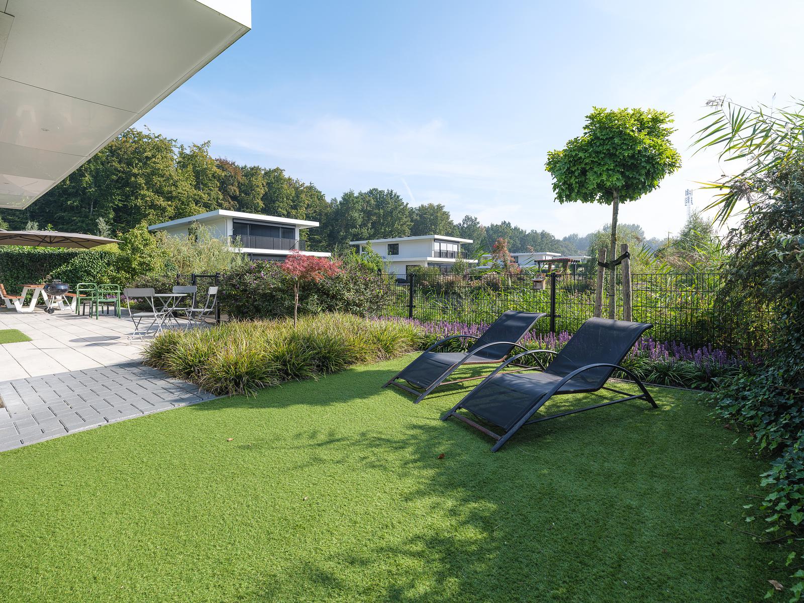 Der komplett eingezäunte Garten bietet viel Platz und Sicherheit für Kinder. Es gibt einen großen Picknicktisch, eine zusätzliche Sitzgruppe, eine Loungeecke und einen Grill für gesellige Abende im Freien. Kinder können sich auf dem Trampolin mit Sicherheitsnetz austoben oder über die Leiter vom privaten Steg aus ins Wasser springen.